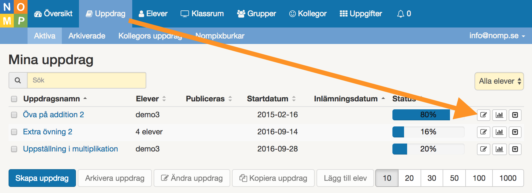 Om du klickar på den kommer du in i samma typ av sida som när du skapade uppdraget. Då kan du ta bort uppgifter, lägga till eller ta bort elever, och ändra andra inställningar på uppdraget.