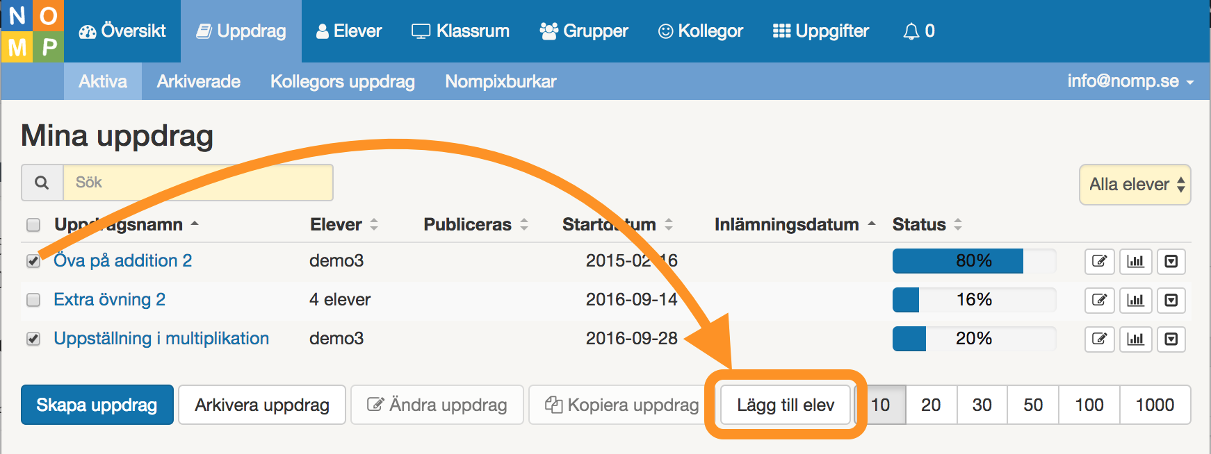 Du kan också markera ett eller flera uppdrag i listan och klicka på knappen "Lägg till elev". Då får du upp en lista av elever som inte har det eller de uppdragen, och du kan välja vilken elev som ska läggas till på uppdragen.