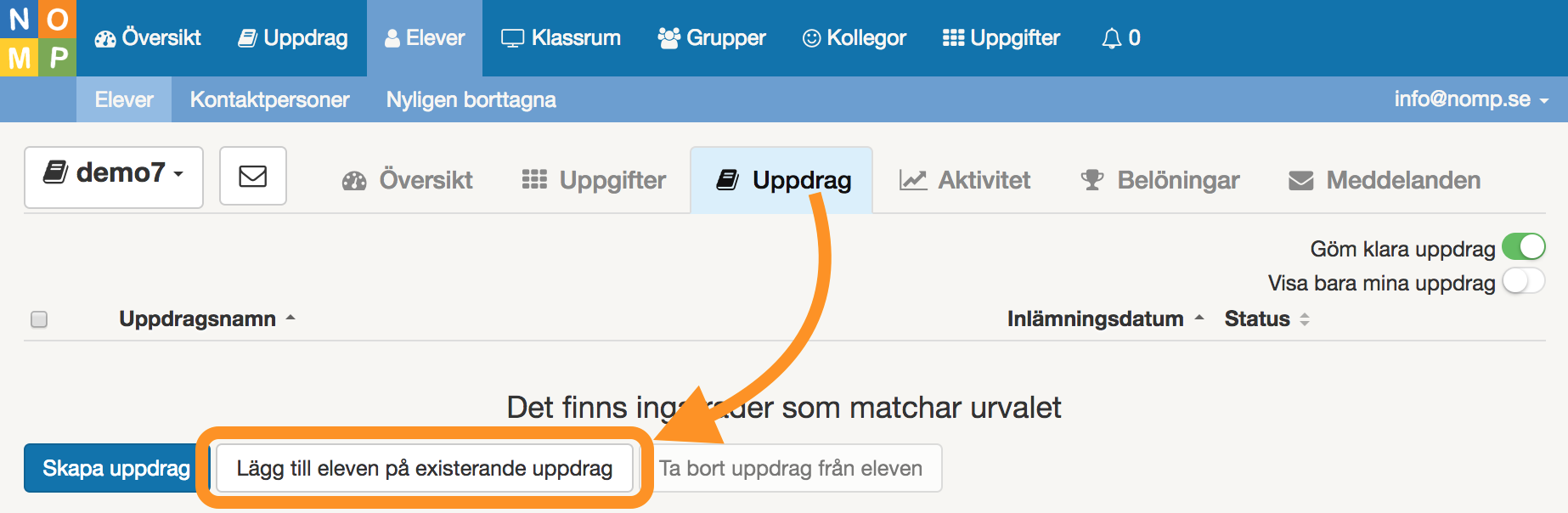 Samma funktion finns under "Elever" om du klickar in dig på en viss elev och sedan väljer fliken "Uppdrag":
