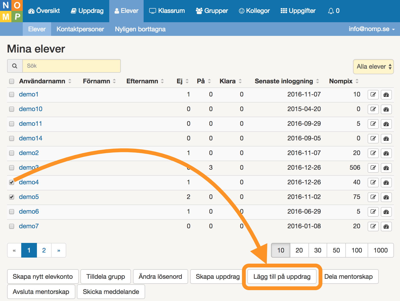 Ytterligare ett sätt är att gå in under "Elever" och välja en eller flera elever i listan, och sedan klicka på knappen "Lägg till på uppdrag". Då får du upp en lista av uppdrag som de valda eleverna inte är med på, och kan välja vilket uppdrag som de ska läggas till på.