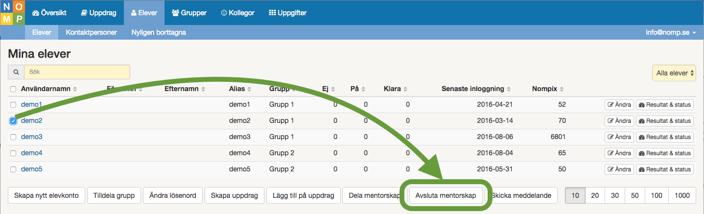 Efter att du har gjort detta så kommer de elevkontona inte att vara kopplade till dig längre. Elevernas användare finns dock fortfarande kvar, i fall eleven kanske vill fortsätta använda Nomp på egen hand, eller kanske koppla sig mot en annan lärare. Undantaget från detta är om du avslutar mentorskapet för en elevanvändare som aldrig har loggat in - den kommer då att tas bort helt från Nomp.