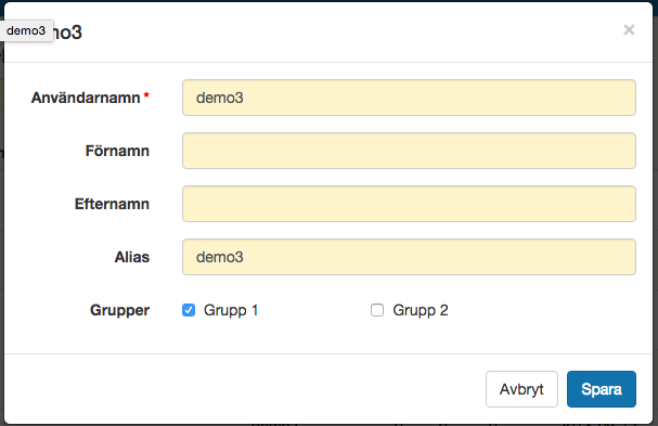 - Klicka på penna-och-papper-ikonen för att ändra på elevens användarkonto. Du får upp ett fönster där du kan ändra användarnamnet, som eleven loggar in med, för- och efternamn, samt vilken grupp eleven tillhör.