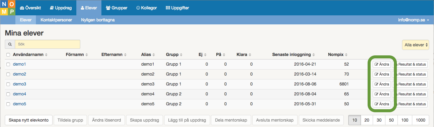 Om du ändrade användarnamnet för en elev som samtidigt är inloggad på Nomp med ett felaktigt användarnamn så är det en bra idé om eleven loggar ut och loggar in igen efter att du har ändrat.