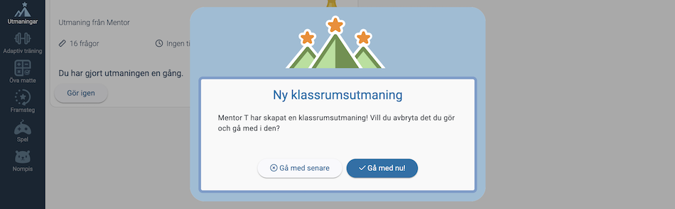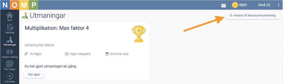 Om de klickade på "Gå med senare", kan de ansluta under "Utmaningar" genom att klicka på "Anslut till klassrumsutmaning".