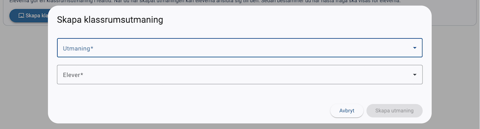 Välj vilka elever som ska kunna ansluta, och vilken utmaning ni ska köra, och klicka sedan på "Skapa utmaning".