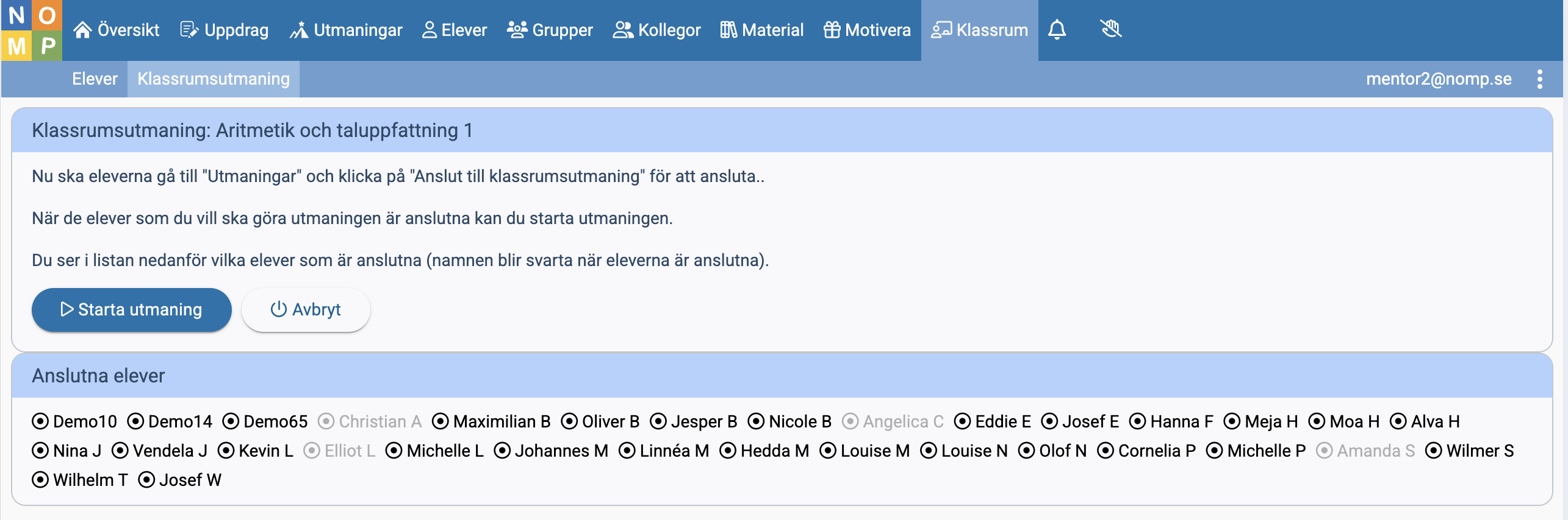 På nästa sida kan du se vilka elever som anslutit sig till utmaningen. När en elev har anslutit sig blir elevens namn svart i stället för grått.