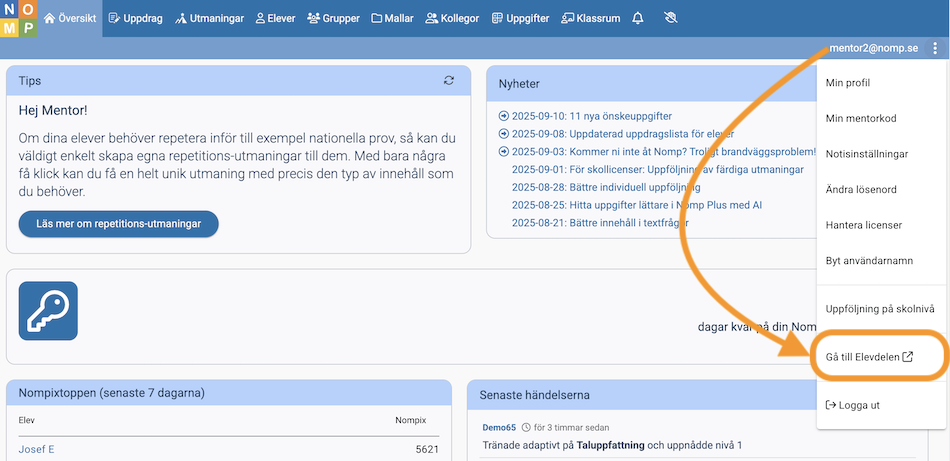 För att göra det klickar du på ditt användarnamn uppe till höger och väljer "Gå till Elevdelen".