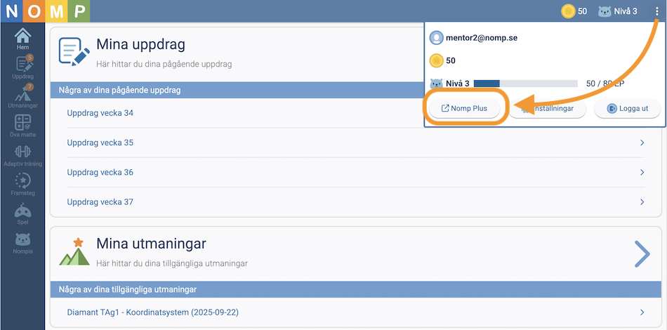 För att gå tillbaka till Nomp Plus klickar du på de tre prickarna i övre högra hörnet och sedan knappen "Nomp Plus".