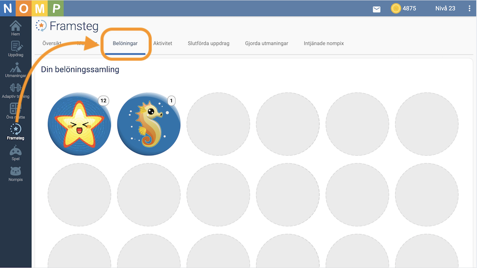 De belöningssymboler som eleverna får kan de se under "Framsteg" > "Belöningar".