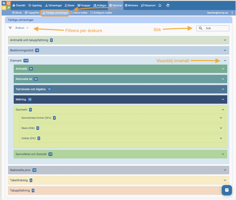 - Här kan du klicka på kategorierna för att navigera till önskat material. Du kan även textsöka eller använda filtret för årskurs.