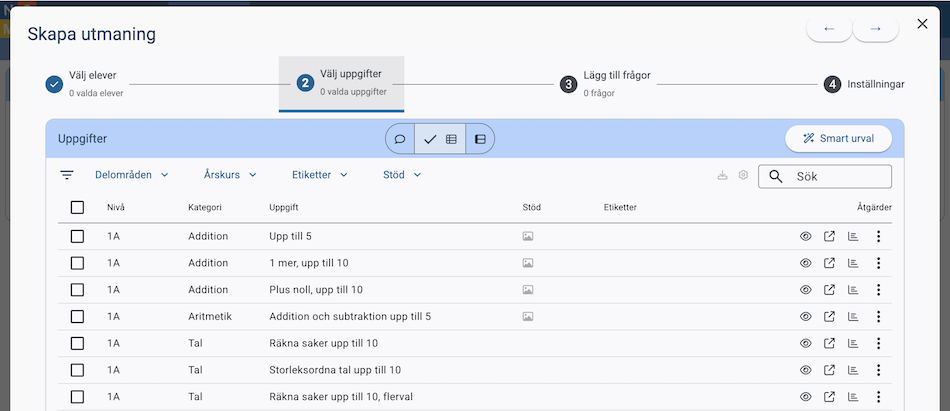 Klicka på fliken "Välj uppgifter". Välj vilka uppgifter som du vill hämta frågor från till utmaningen. Här kan du söka och filtrera uppgifterna på olika sätt om du vill, och du har tillgång till AI-uppgiftsletaren.