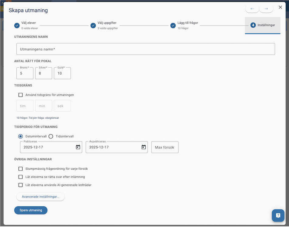 - Antal rätt för pokal: Här bestämmer du hur många rätt en elev ska ha för att få brons-, silver- respektive guld-pokal på utmaningen.