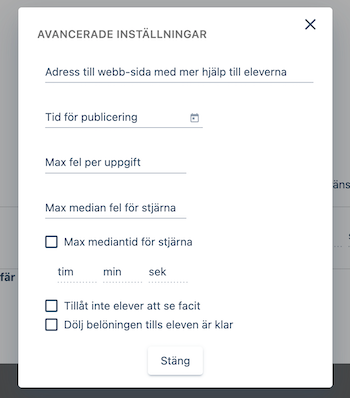 Fälten "Max median fel för stjärna" och "Max mediantid för stjärna" har att göra med att eleverna kan få stjärnor på uppgifter automatiskt när de gör klart uppdraget, om det går tillräckligt bra. Vi kommer att gå igenom det här med fokus och stjärnor detaljerat senare i kursen.
