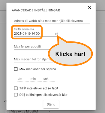 I fältet "Tid för publicering" kan du ange datum och tid då uppdraget ska bli tillgängligt för eleverna. Klicka på kalender-symbolen i kanten för att ställa in detta. Om du inte ställer in något här så blir uppdraget tillgängligt för eleverna direkt.