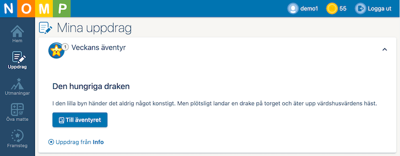Ett äventyrsuppdrag är som ett vanligt uppdrag, men uppgifterna blandas med en berättelse som eleven läser eller lyssnar på. För att komma vidare i berättelsen behöver eleven göra uppgifterna i uppdraget.