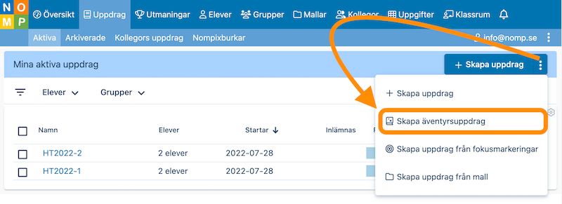 Så här gör du för att skapa ett äventyrsuppdrag åt en eller flera elever i Nomp Plus: