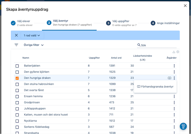 - Välj vilka elever som ska få uppdraget och klicka sedan på fliken "Välj äventyr".