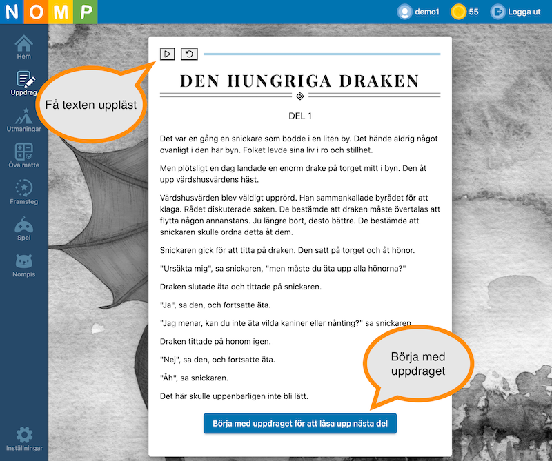 Eleven kan få texten uppläst genom att använda ljuduppspelaren som ligger överst. När eleven läst eller lyssnat klart klickar hen på knappen längst ner för att fortsätta till den första uppgiften i äventyret.