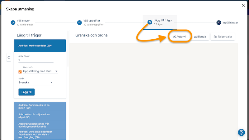 - Systemet kommer fördela frågorna så jämnt som möjligt mellan de valda uppgifterna.