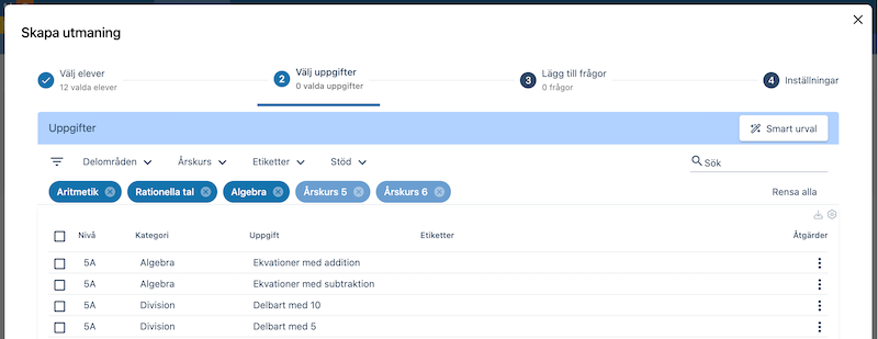 På fliken där du väljer uppgifter behöver du filtrera till exempel på delområde eller årskurs, eller både och. Eller filtrera på någon av dina etiketter, eller gör en sökning.