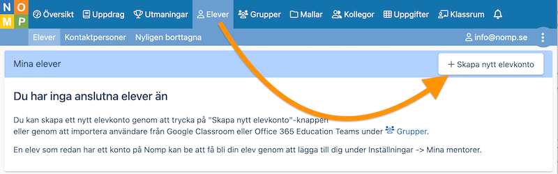 Om dina elever inte har Nomp-användare sedan tidigare, och du inte har möjlighet att importera dem, så kan du enkelt skapa användarkonto åt dem från Nomp Plus. Det gör du under "Elever" i Nomp Plus: