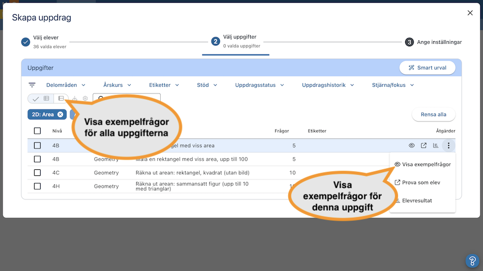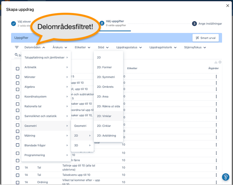 Det lättaste sättet att hitta rätt uppgifter är att använda delområdesfiltret, som du hittar uppe till vänster när du väljer uppgifter till uppdraget. Det går också att filtrera uppgifterna per årskurs.