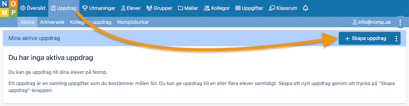 När du har kopplat dig mot någon eller några elever i Nomp Plus så kan du börja skapa uppdrag till eleverna. Ett uppdrag är som en läxa som eleverna gör i Nomp. Uppdraget kan gå ut på att göra en viss uppgift i Nomp ett visst antal gånger, eller att klara en uppgift under en viss tid.