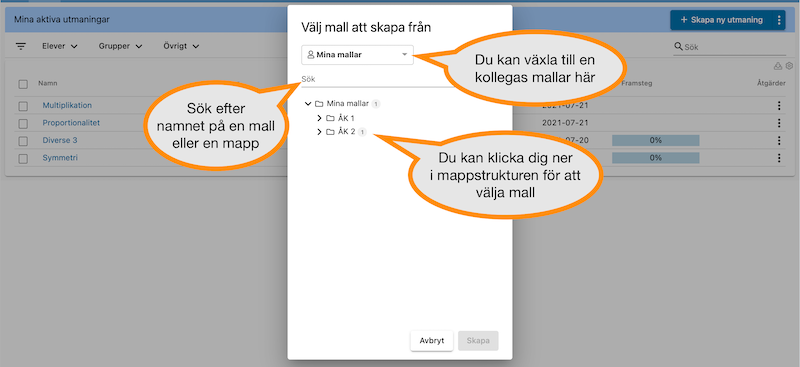 Om du vill kunna återanvända uppdrag och utmaningar på ett enklare sätt, så kan du skapa mallar från dem. Sedan kan du använda mallarna när du ska skapa nya uppdrag eller utmaningar åt dina elever.