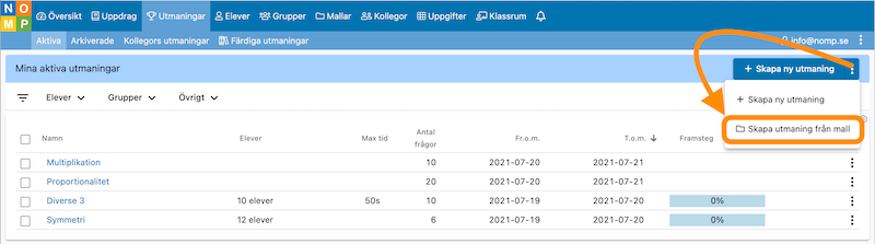 Det enklaste sättet att använda en mall är att klicka fram undermenyn under "Skapa uppdrag"/"Skapa utmaning" och välja att "Skapa uppdrag/utmaning från mall".